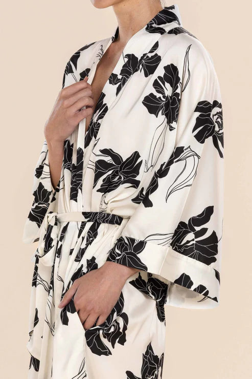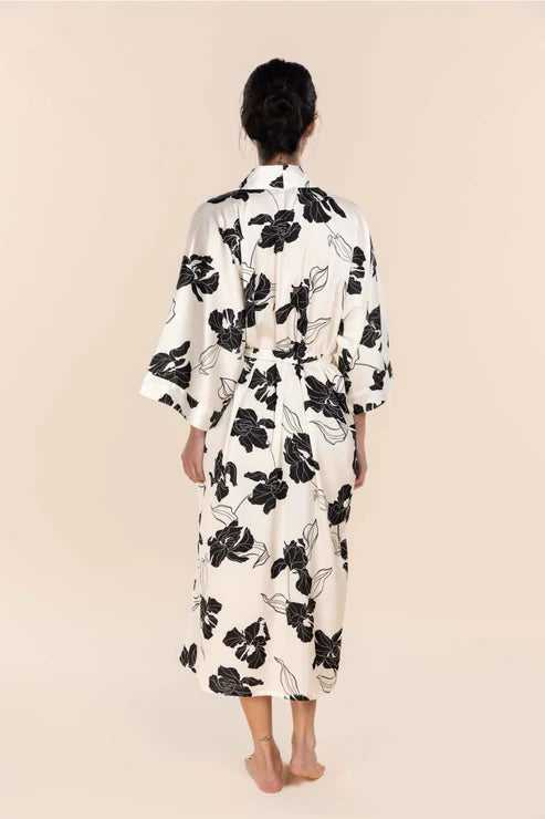 Wrap yourself in the Daisy Long Robe in a black and white iris print. Crafted from recycled silky satin, it drapes beautifully to create a flattering, fluid silhouette. Thoughtfully designed with an adjustable waist tie, an inner tie to keep it perfectly in place, and a side pocket for convenience, this lightweight robe is perfect for slow mornings, pre-event preparation, or layering over your favourite pyjamas for a polished at-home look.