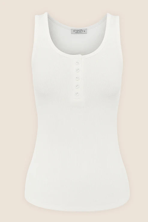 Simple and easy to wear, the Liberty Ribbed Singlet Henley Top from Gingerlilly in Ivory offers a close but comfortable fit that isn’t restrictive. Finished with a Henley button placket, gently curved hem, and a subtle logo near the bottom side seam, it’s a quiet classic for year-round layering or relaxed sleepwear.